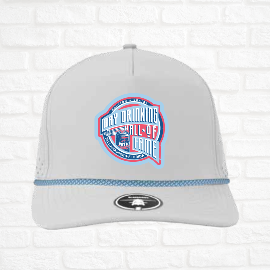 Day Drinking Hall of Fame Rubber Patch on White Hat with light blue rope on brim