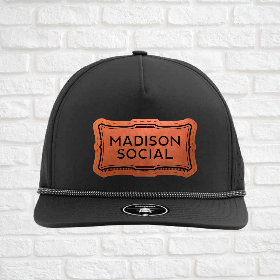 Madison Social logo laser engraved brown leather patch on black hat with chainlink rope on brim