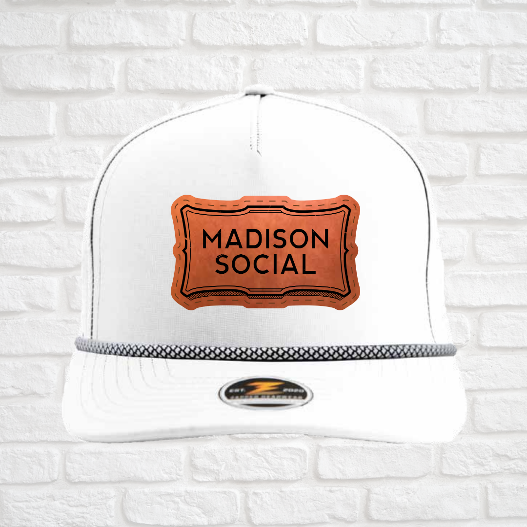 Madison Social logo laser engraved brown leather patch on white hat with chainlink rope on brim