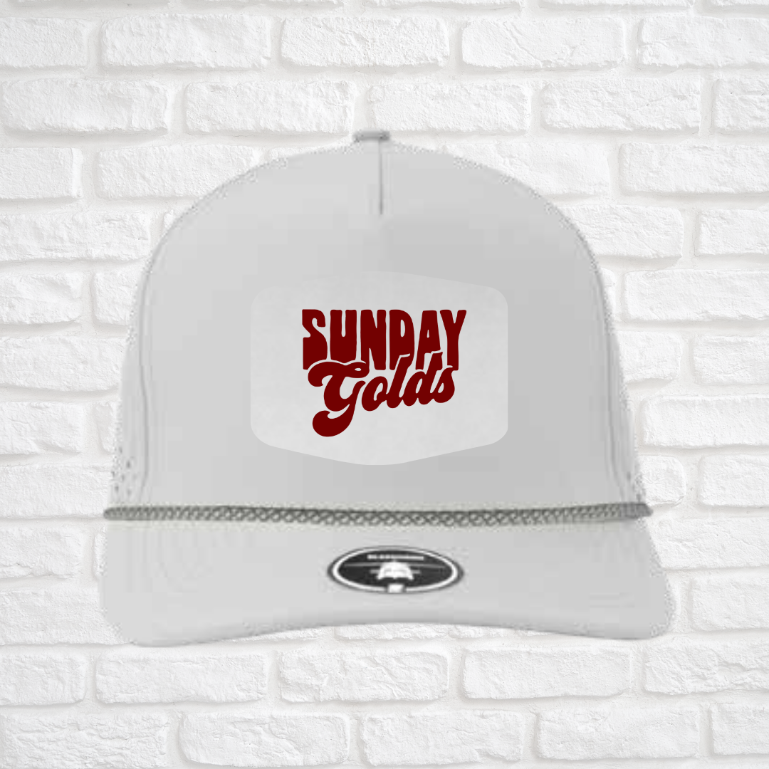 Sunday Golds design laser engraved brown leather patch on white hat with chainlink rope on brim