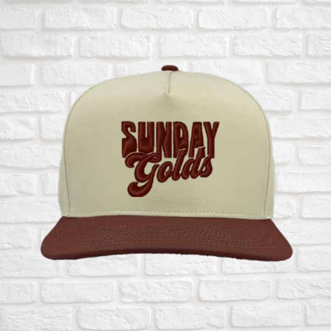 Sunday Golds embroidered on vintage white hat with maroon bill.