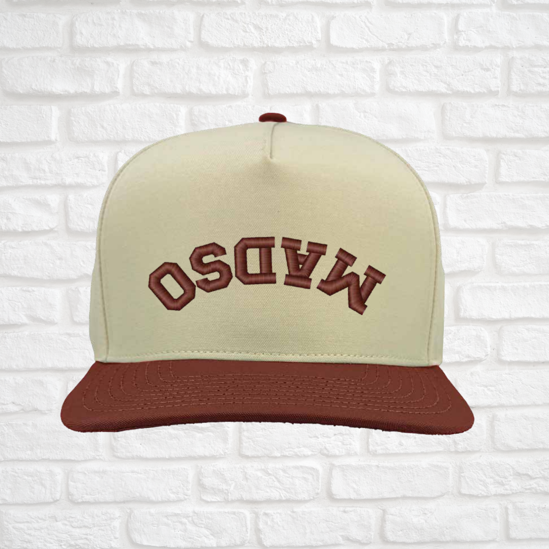 Upside down MadSo embroidered on vintage white hat with maroon bill.